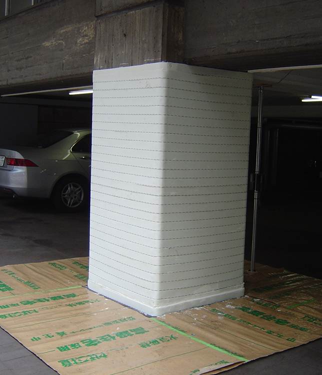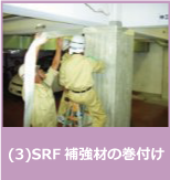 SRF工法は、しなやかで強靭なポリエステル繊維のベルトやシートを、ウレタン系一液性無溶剤接着剤で鉄筋コンクリート(RC)の柱、壁等に貼り付け、巻き付ける工法です。鉄筋コンクリートの損傷と破壊を直接防止し、新材料(Recovered Reinforced Concrete:R2C)と呼べる程の強靭性を付与することが、各種の実験で確認されています。コンクリートをしなやかで切れない材料で被覆することを耐震被覆と呼んでいます。SRF工法は包帯補強とも呼ばれています。