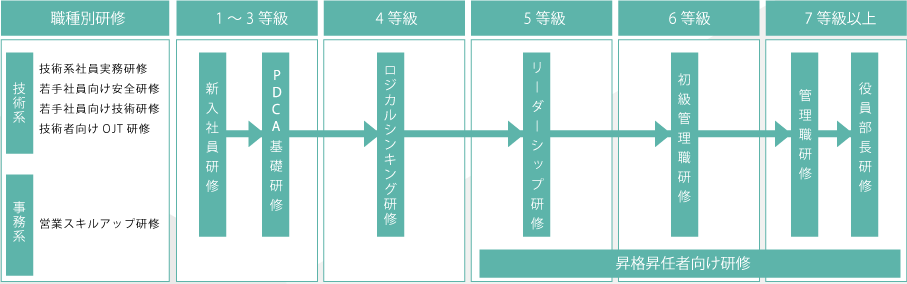 社員一人一人の階層に応じて求められる能力を明確化し、PDCAやリーダーシップ研修をはじめ、昇格昇任者向け研修、スキルアップ研修など様々な研修を設けています。